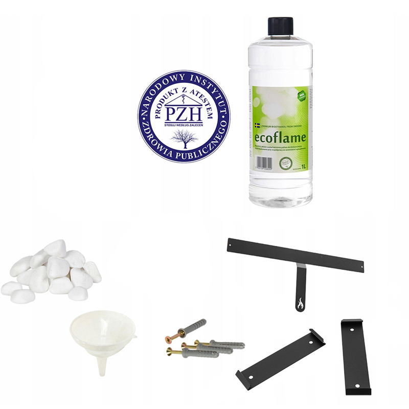 Biokominek wyposażony jest w listwy montażowe, które umożliwiają szybki i prosty montaż. Konstrukcja ramy frontowej o szerokości 70 mm sprawia, że całość wygląda lekko i nie przytłacza wnętrza, pozwalając skupić się na ogniu.