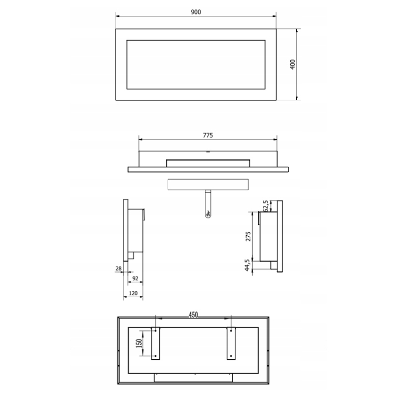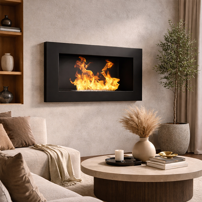 Ten model został zaprojektowany jako stały element wnętrza, a nie chwilowy dodatek. To biokominek do zawieszenia na ścianie lub montażu w zabudowie, który tworzy długą, spokojną linię ognia i realnie zmienia charakter przestrzeni.